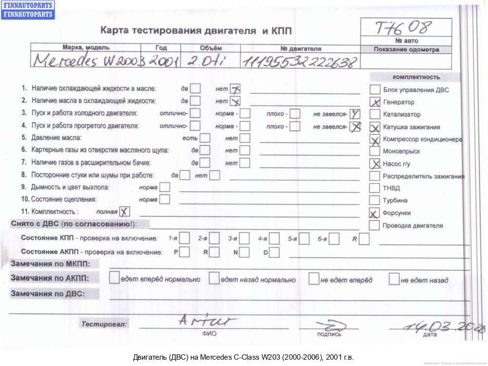 | Казань | 2003 | A6460104102, 2003, 2.2л, Дизель, CDI, OM 646.963, 64696330130704, A6460104102, Универсал, серебристый, 64696330130704 | - | Г | К | Н | КК | ТУ, прокручивается , состояние ГРМ - нормально, поддон -нормально, клапанная крышка - нормально, эмульсия - нет, треснут воздухозаборник , дефект шкива г/у и компрессора, | |||